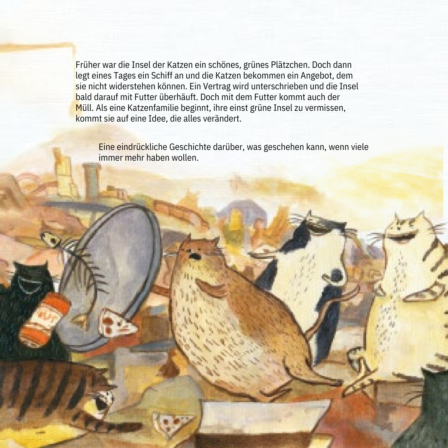 Früher war die Insel der Katzen ein schönes, grünes Plätzchen. Doch dann legt eines Tages ein Schiff an und die Katzen bekommen ein Angebot, dem sie nicht widerstehen können. Ein Vertrag wird unterschrieben und die Insel bald darauf mit Futter überhäuft. Doch mit dem Futter kommt auch der Müll. Eine Katzenfamilie beginnt, ihre einst grüne Insel zu vermissen. Eines Tages hat sie eine Idee, die alles verändert.
