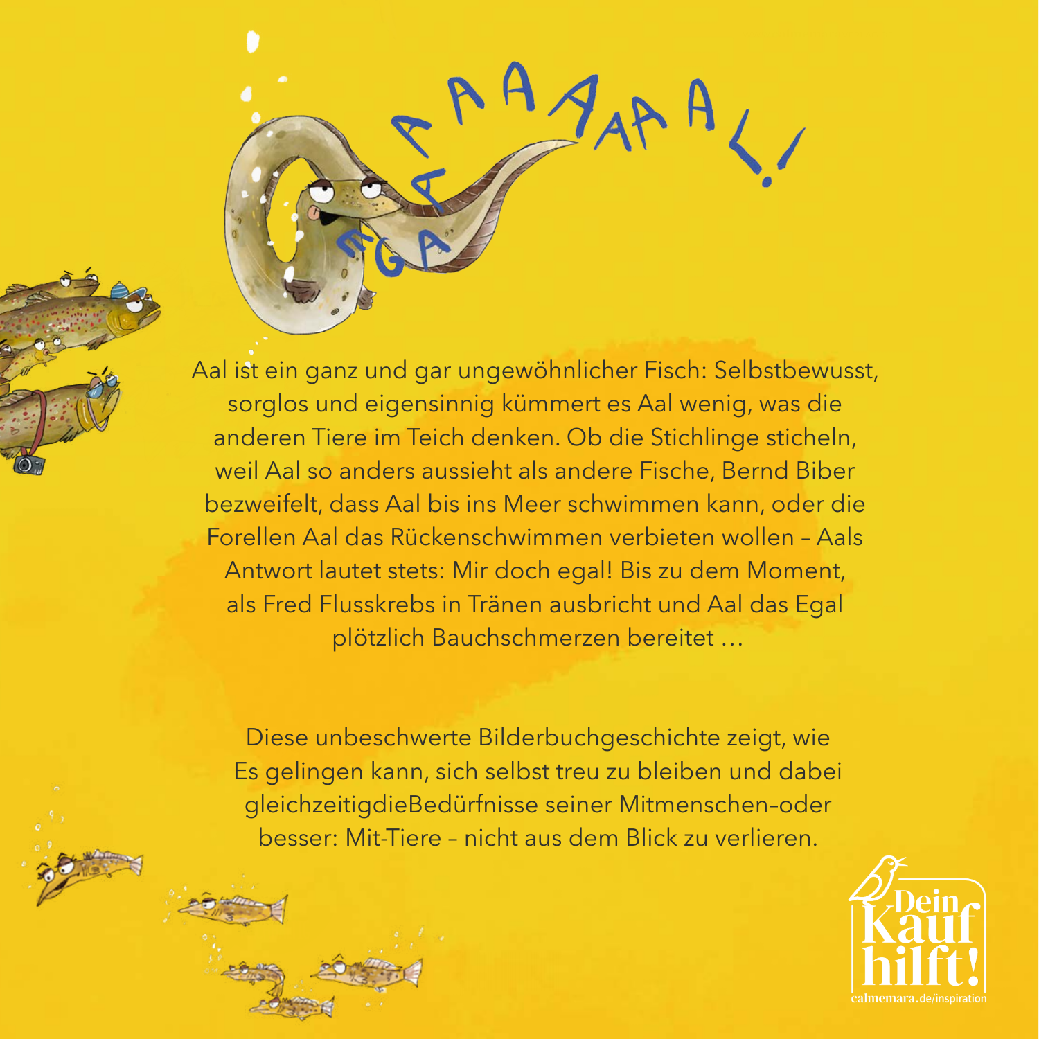 In unserem beliebten Bilderbuch »Egal, sagt Aal« zeigt Sympathie-Tier Aal, wie es gelingen kann, sich selbst treu zu bleiben und dabei gleichzeitig die Bedürfnisse seiner Mitmenschen – oder besser: Mit-Tiere – nicht aus dem Blick zu verlieren. Für alle kleinen Fans gibt es dazu ein cooles T-Shirt in knalligem Gelb mit witziger Aal-Illustration. Damit macht das Lesen doch gleich noch viel mehr Spaß!