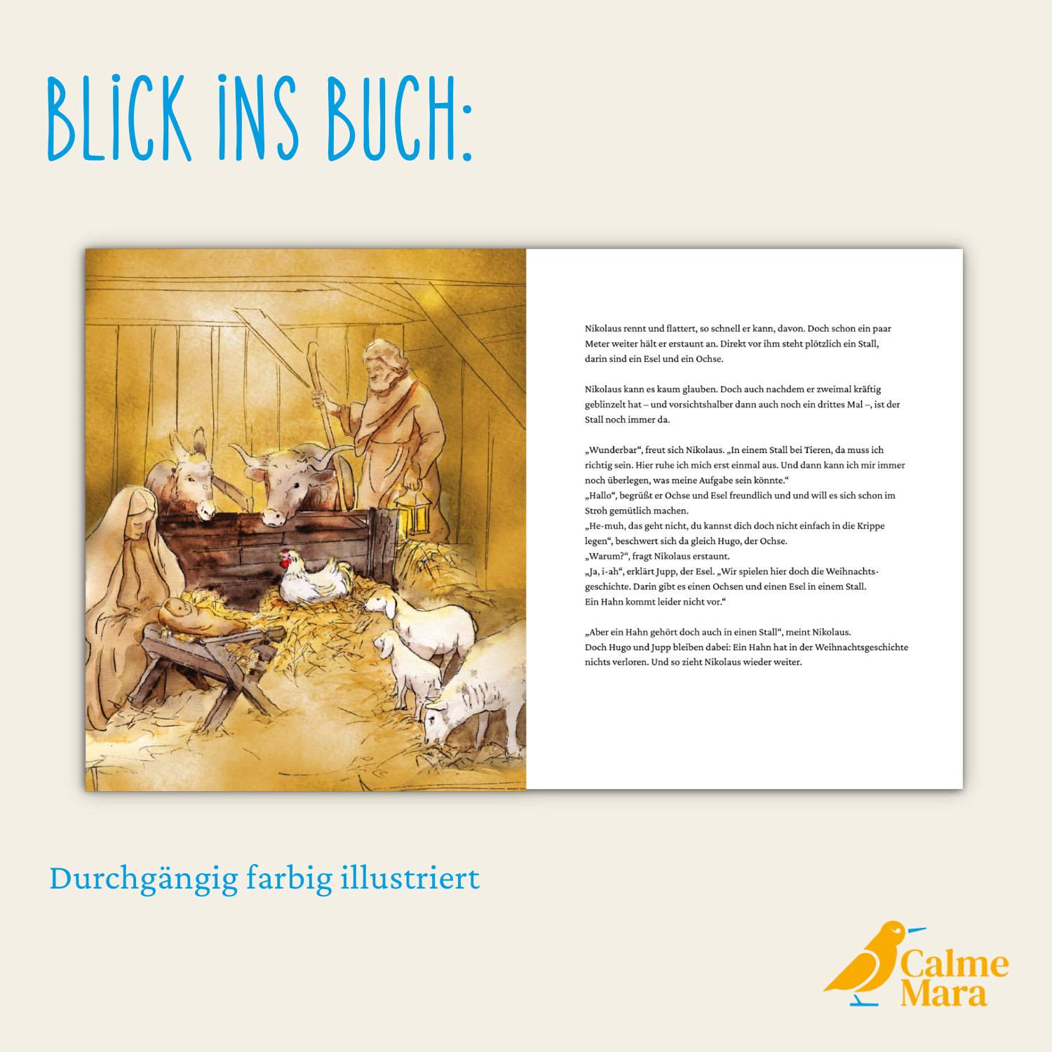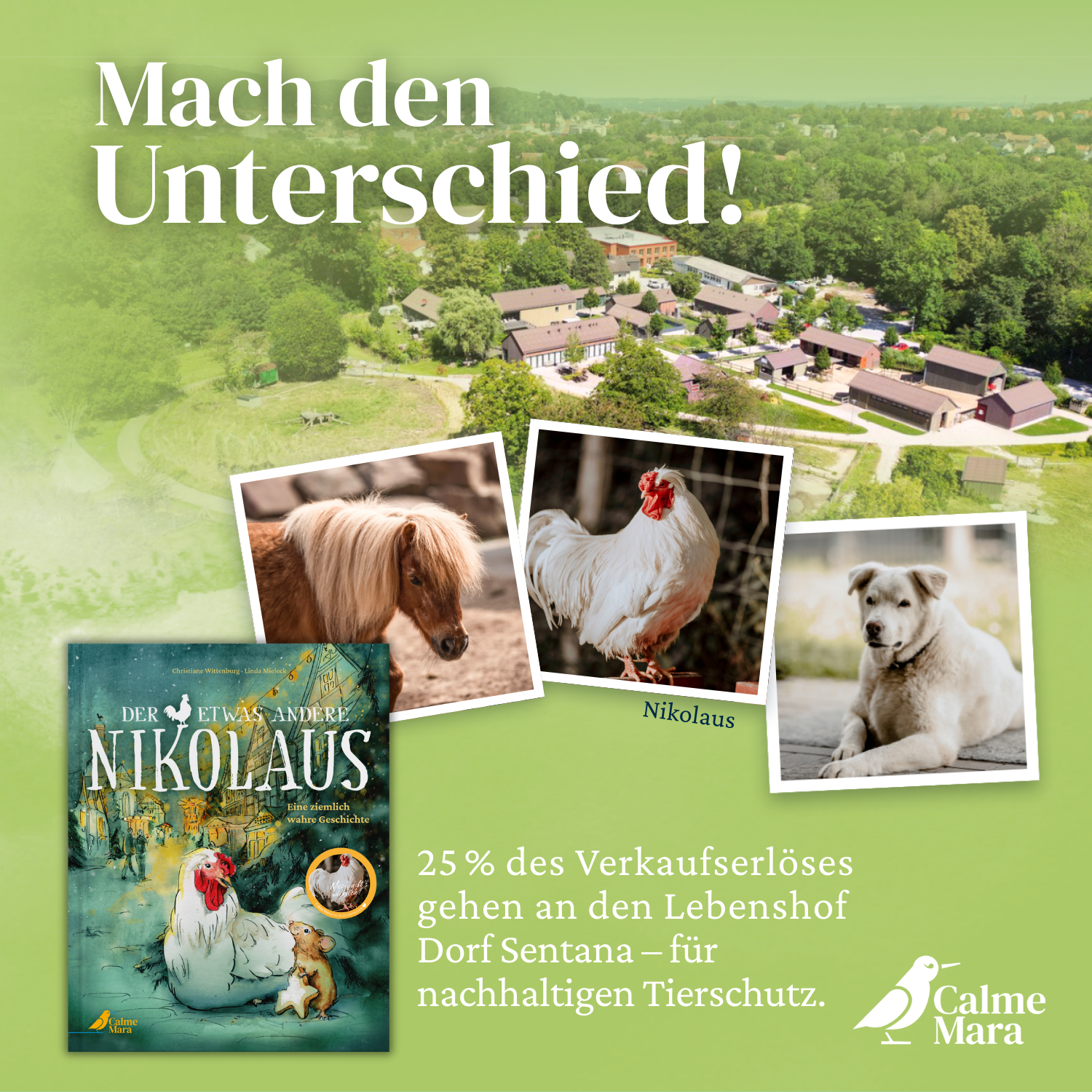 Nicht nur Nikolaus ist glücklich, im Dorf Sentana ein neues Zuhause gefunden zu haben, auch für den Begegnungs- und Gnadenhof war Nikolaus’ Auftauchen am 6. Dezember 2019 ein wahres Vorweihnachtsgeschenk. Die erstaunlichen Tiergeschichten aus dem Dorf Sentana haben uns zur Gründung von CalmeMara inspiriert. Jeder Buchkauf unterstützt die tierischen Bewohner und sozialen Projekte im Dorf.