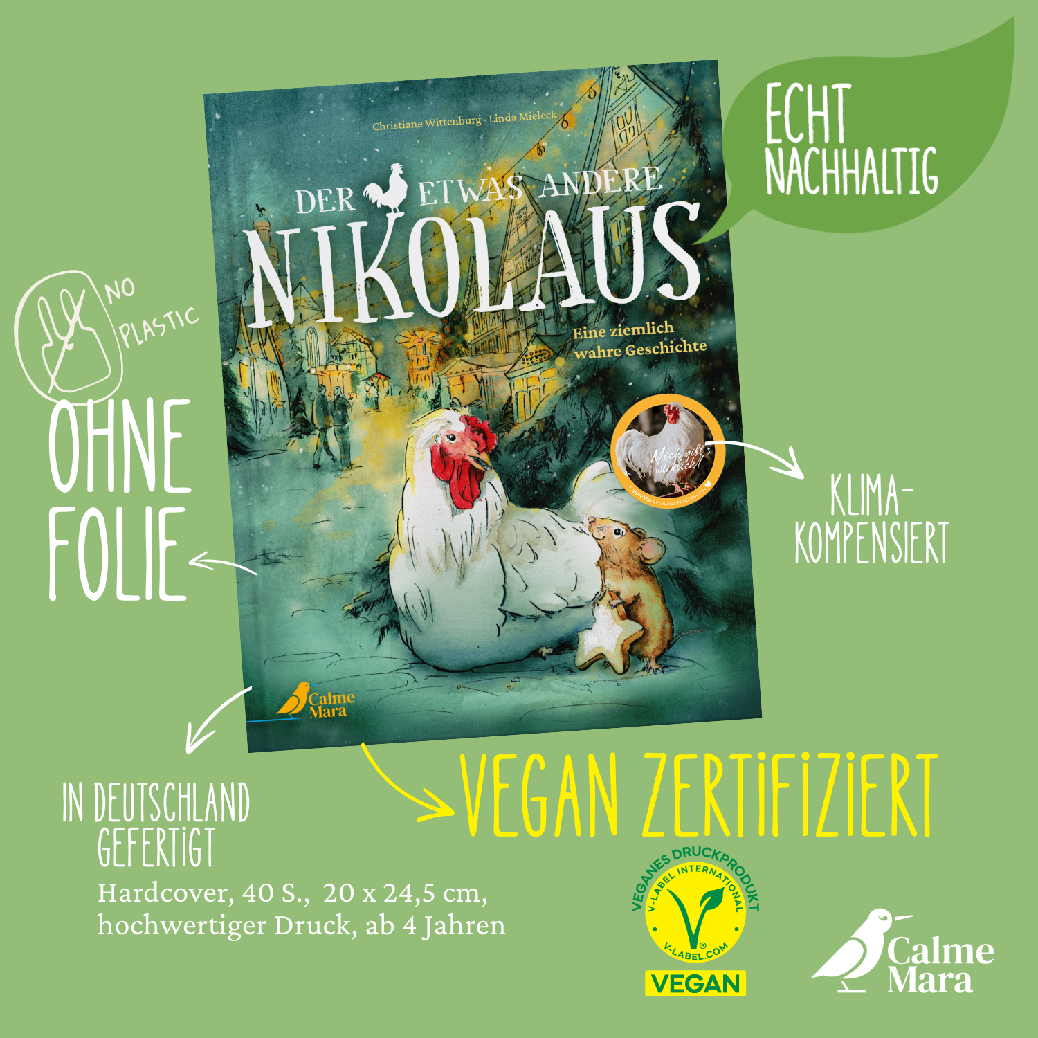 Im Bilderbuch »Der etwas andere Nikolaus« erzählt Christiane Wittenburg die wirklich wahre Geschichte von Hahn Nikolaus, der 2019 ganz allein seinen Weg auf den Begegnungs- und Gnadenhof Dorf Sentana fand. Wundervoll illustriert von Linda Mieleck erwacht das Abenteuer rund um Nikolaus zum Leben. Ein winterlich-weihnachtliches Bilderbuch für alle Kinder ab 4 Jahren, das zeigt: Auch für dich ist Platz in dieser Welt. Du bist wichtig und wertvoll, einfach weil du du bist!