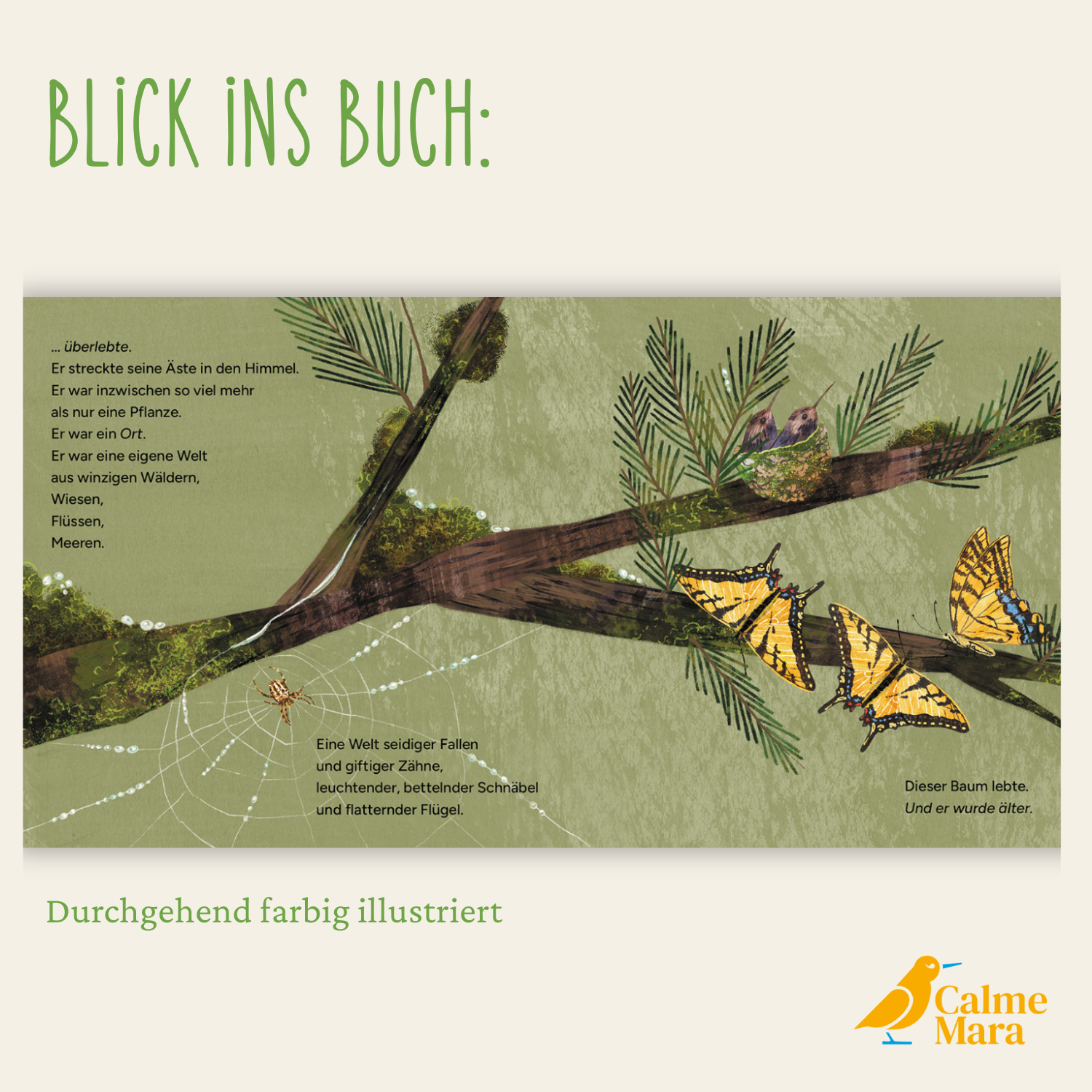 Ein alter Baum – krumm und knorrig steht er da, einige Äste sind bereits abgebrochen. Eines Tages wird sein Leben enden. Oder doch nicht? Seine Geschichte beginnt als winziger Samen, der durch die Luft segelt und im Boden ein Zuhause findet. Der Baum wächst heran und bietet im Laufe der Zeit immer mehr Tieren Nahrung, Schutz und Unterschlupf. Er übersteht Kälte, Stürme, Trockenheit und sogar einen Waldbrand. Und trotzdem wird er eines Tages umstürzen, wenn seine Zeit gekommen ist. Doch selbst dann wird die Geschichte dieses Baumes noch nicht zu Ende sein …