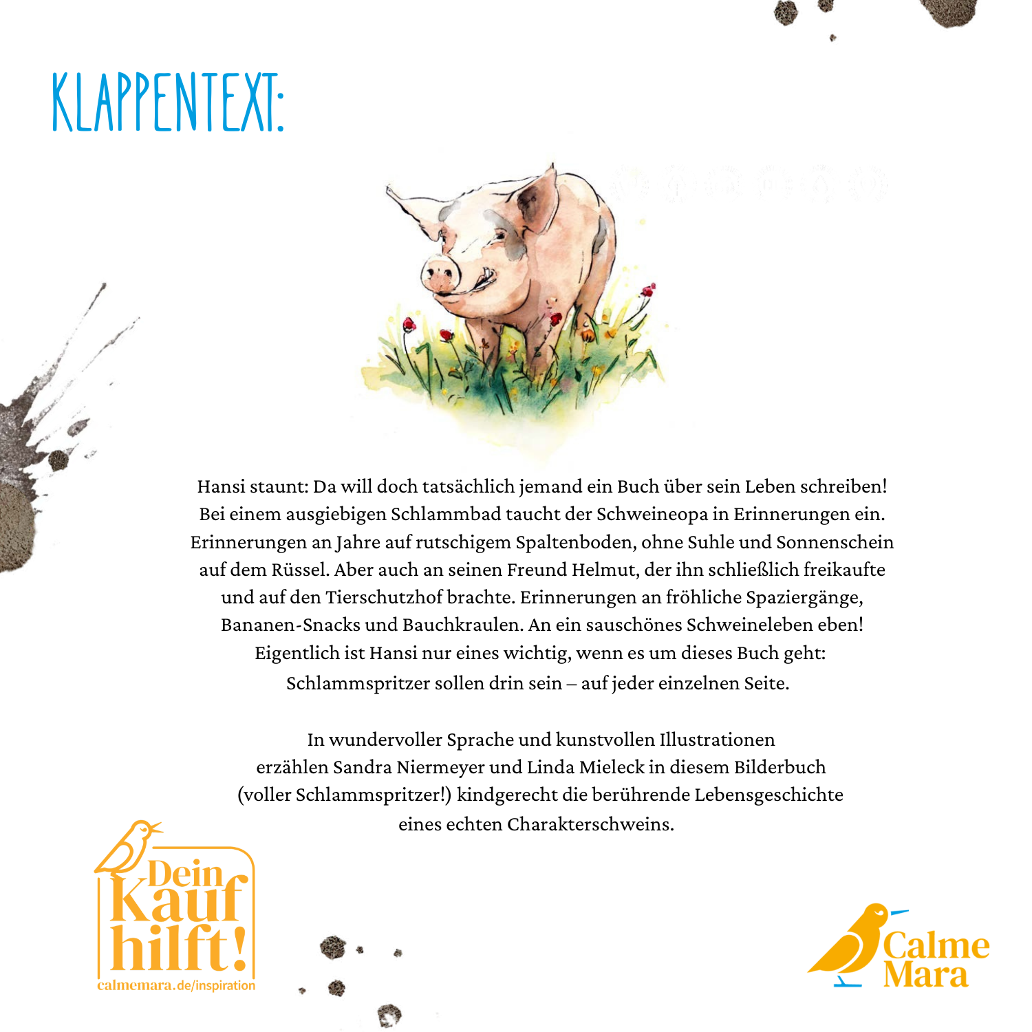 Hansi staunt: Da will doch tatsächlich jemand ein Buch über sein Leben schreiben! Bei einem ausgiebigen Schlammbad taucht der Schweineopa in Erinnerungen ein. Erinnerungen an Jahre auf rutschigem Spaltenboden, ohne Suhle und Sonnenschein auf dem Rüssel. Aber auch an seinen Freund Helmut, der ihn schließlich freikaufte und auf den Tierschutzhof brachte. Erinnerungen an fröhliche Spaziergänge, Bananen-Snacks und Bauchkraulen. An ein sauschönes Schweineleben eben! Eigentlich ist Hansi nur eines wichtig, wenn es um dieses Buch geht: Schlammspritzer sollen drin sein – auf jeder einzelnen Seite.