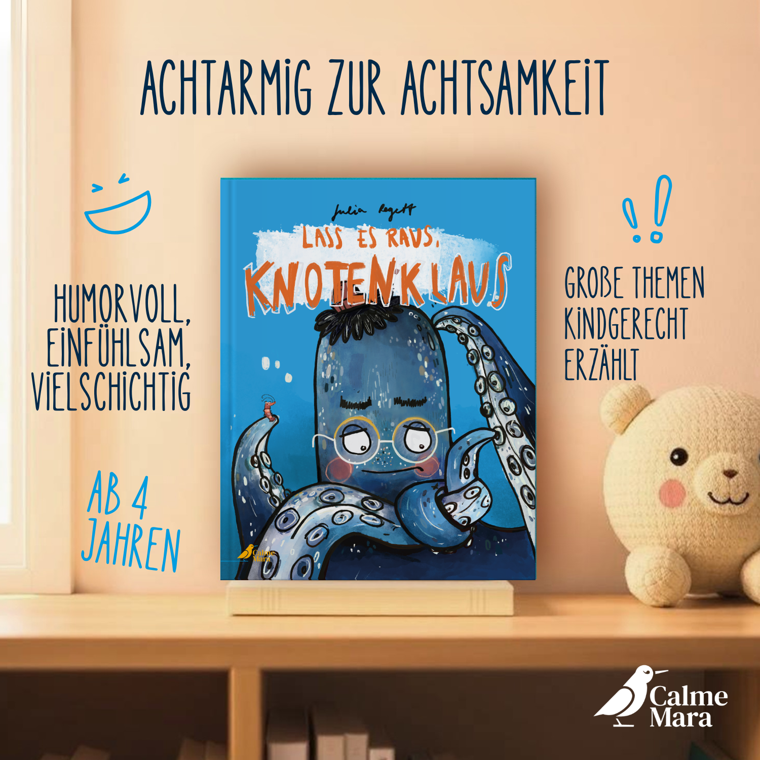 Klaus ist ein kurzsichtiger Oktopus mit acht Fangarmen und drei Herzen, die immer wild durcheinander pochen, wenn etwas Neues passiert. Deshalb bleibt er am liebsten in seiner Höhle – bis er eines Morgens einen Knoten in seinem Lieblingsarm entdeckt! Mit pochenden Herzen wagt sich Knotenklaus ins offene Meer, um Hilfe zu suchen … und findet Gitti Garnele. Die hat zwar keine Lösung, aber genug Mut für beide zusammen. Auf ihrer gemeinsamen Reise durch den Ozean lernt der schüchterne Knotenklaus, so achtsam wie ein Blauwal, so wütend wie ein Einsiedlerkrebs und fast so mutig wie Gitti Garnele zu sein.