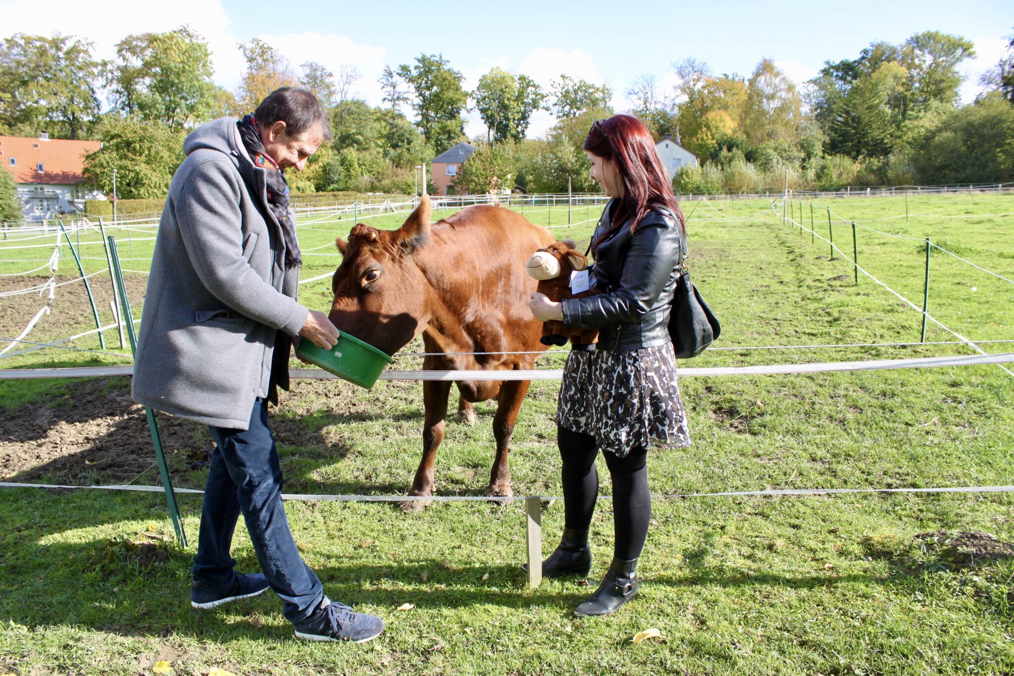 Verleger Ralph Anstoetz und Autorin Sandy Jud besuchen Kuh Elsa