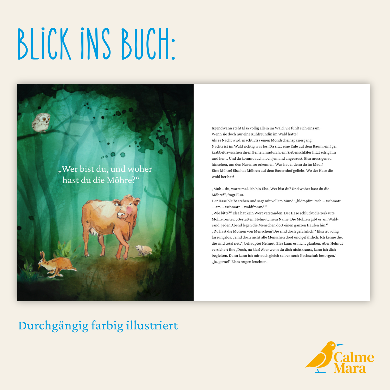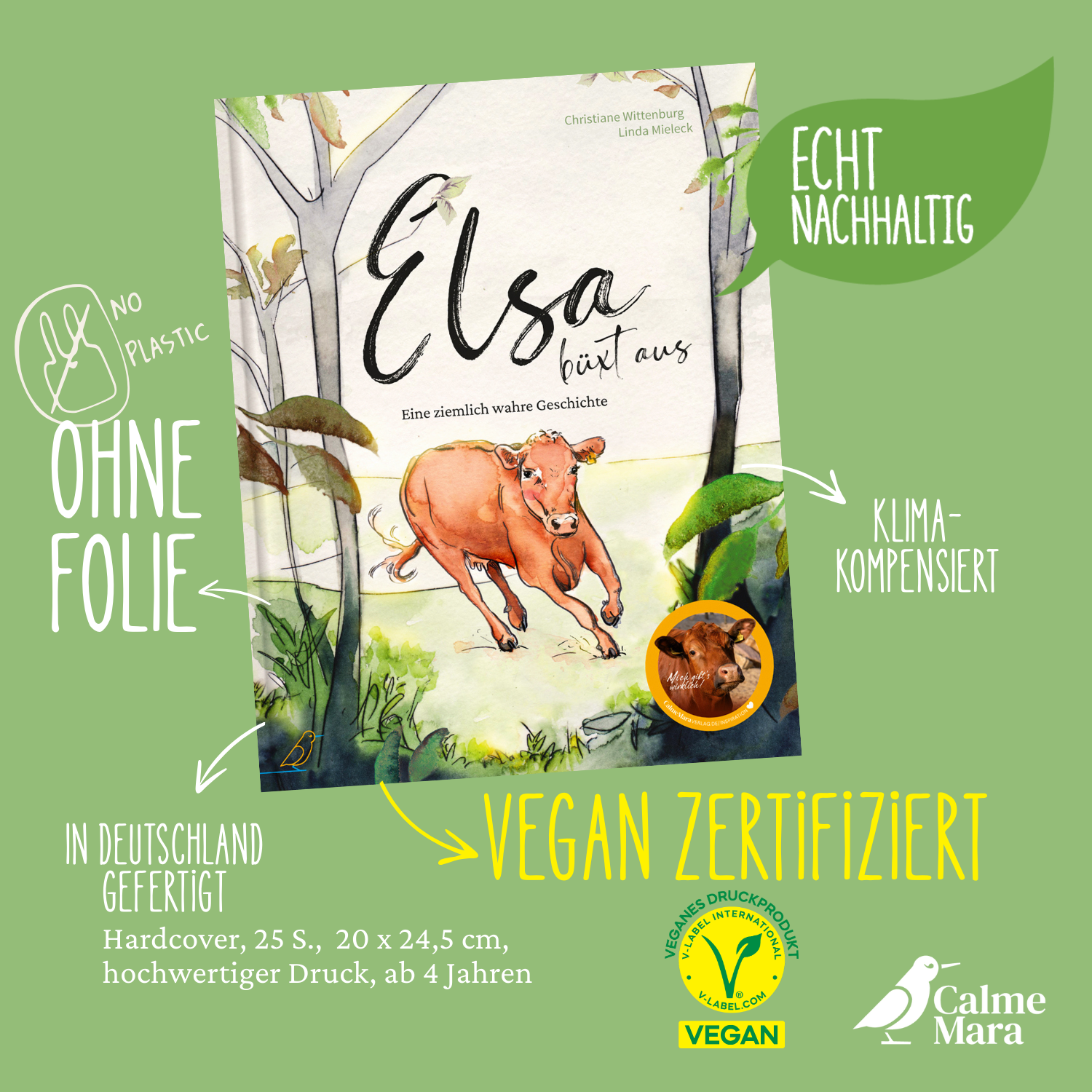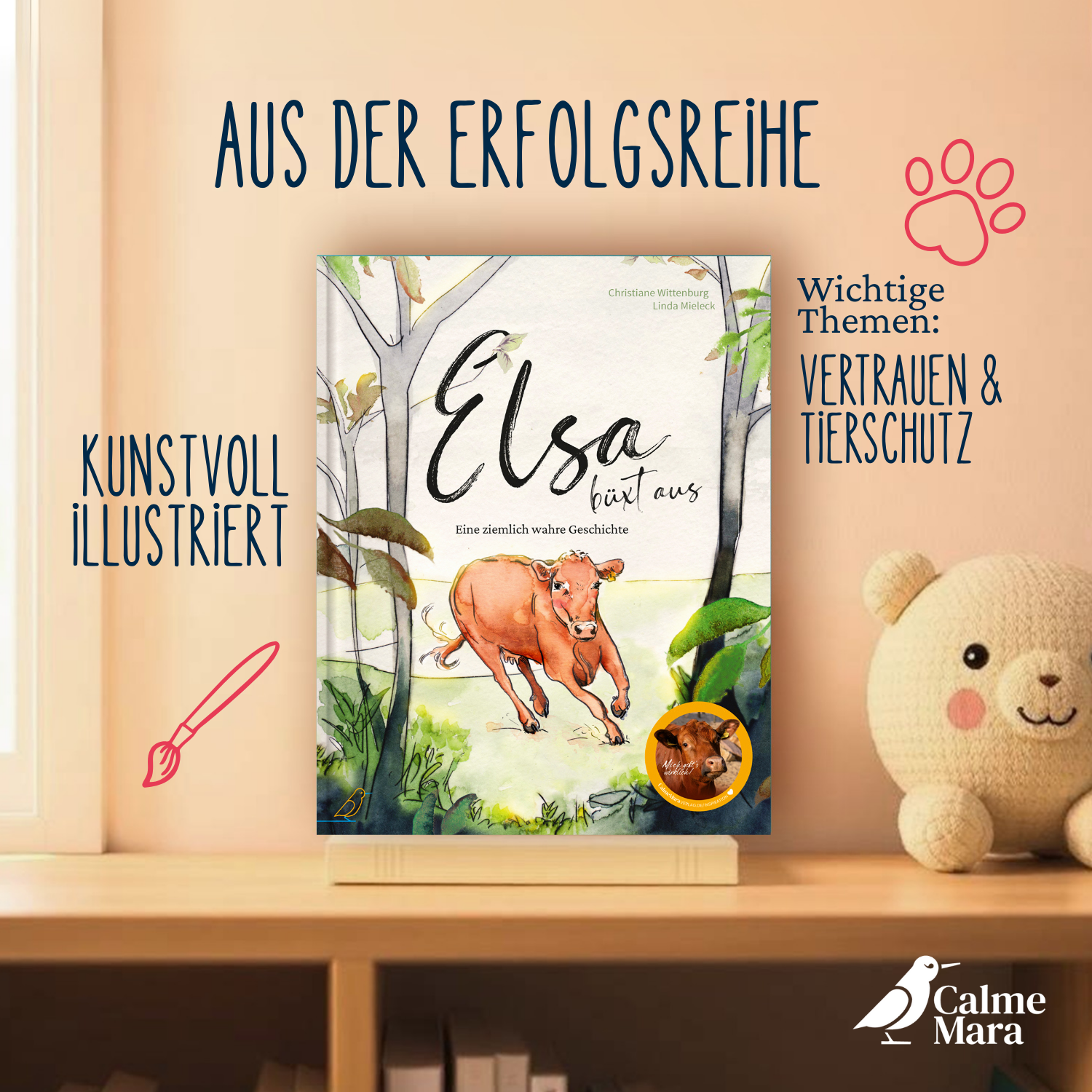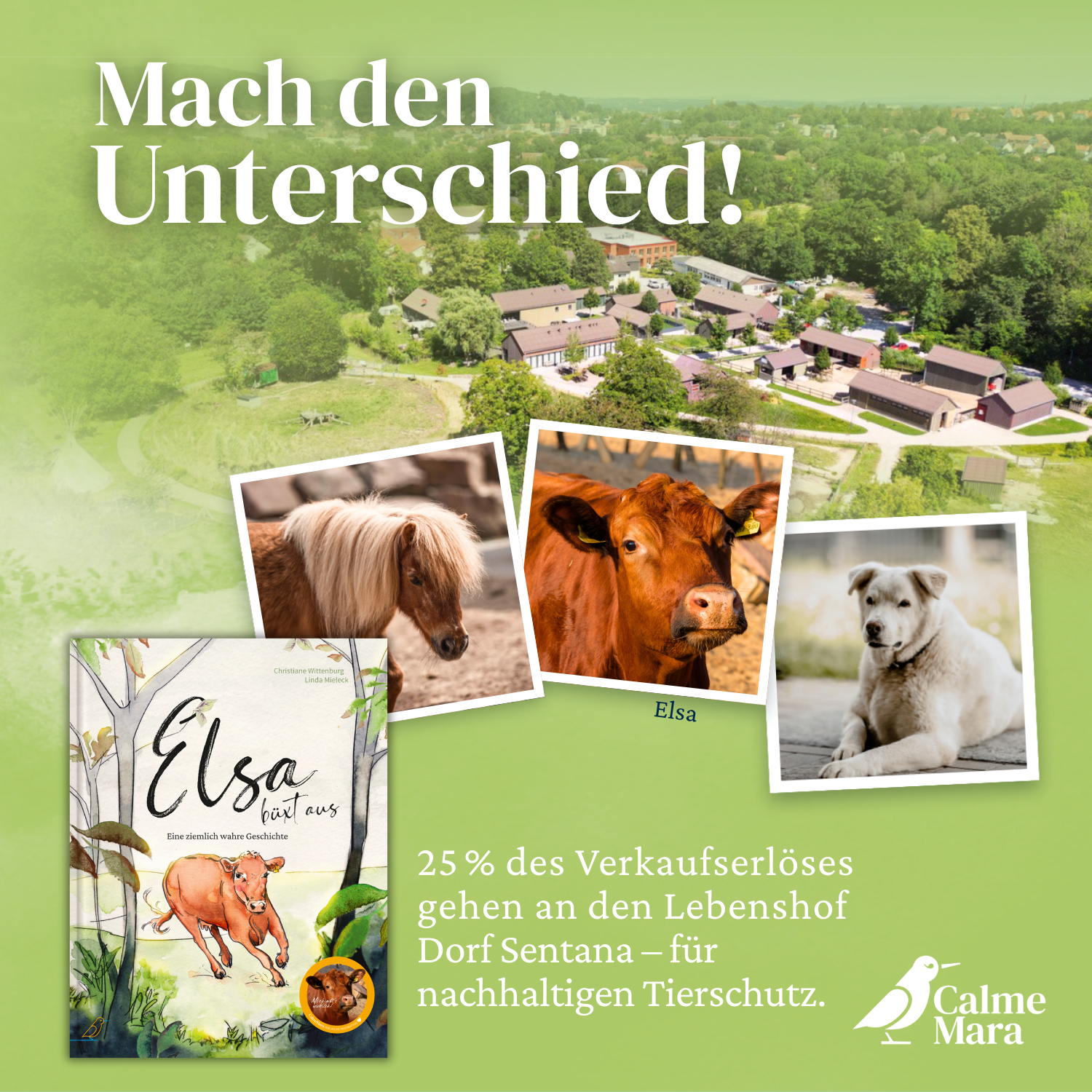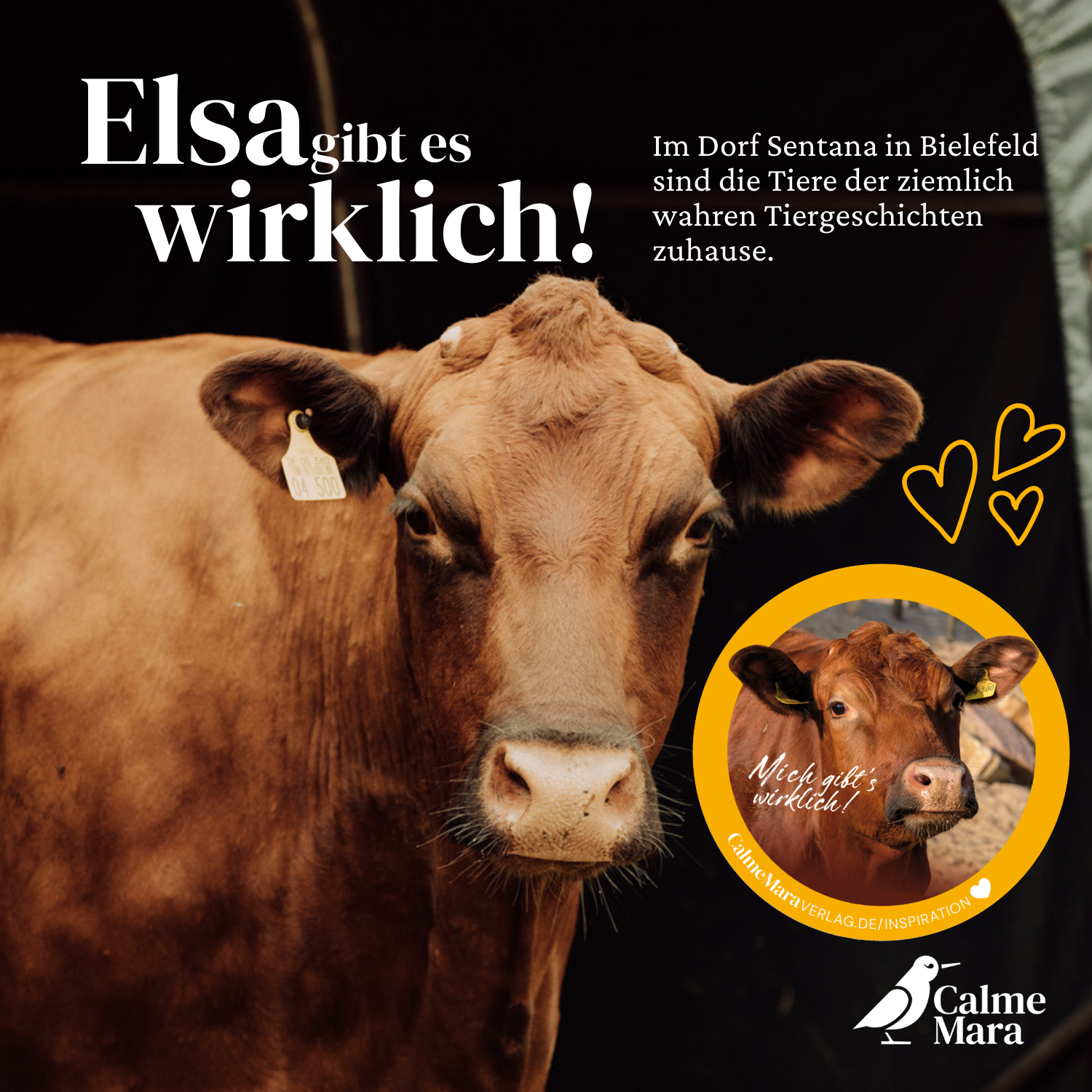 Elsa ist nicht nur im Bilderbuch, sondern auch im echten Leben eine Heldin. Nach ihrer Flucht von einem Schlachthof hielt sie zehn Wochen lang die ganze Region in Atem. Heute lebt Elsa auf dem Begegnungs- und Lebenshof Dorf Sentana in Bielefeld, der uns zur Gründung von CalmeMara inspiriert hat. Jeder Buchkauf unterstützt die tierischen Bewohner und sozialen Projekte im Dorf. Du möchtest Elsa persönlich kennenlernen? Sie freut sich auf deinen Besuch!