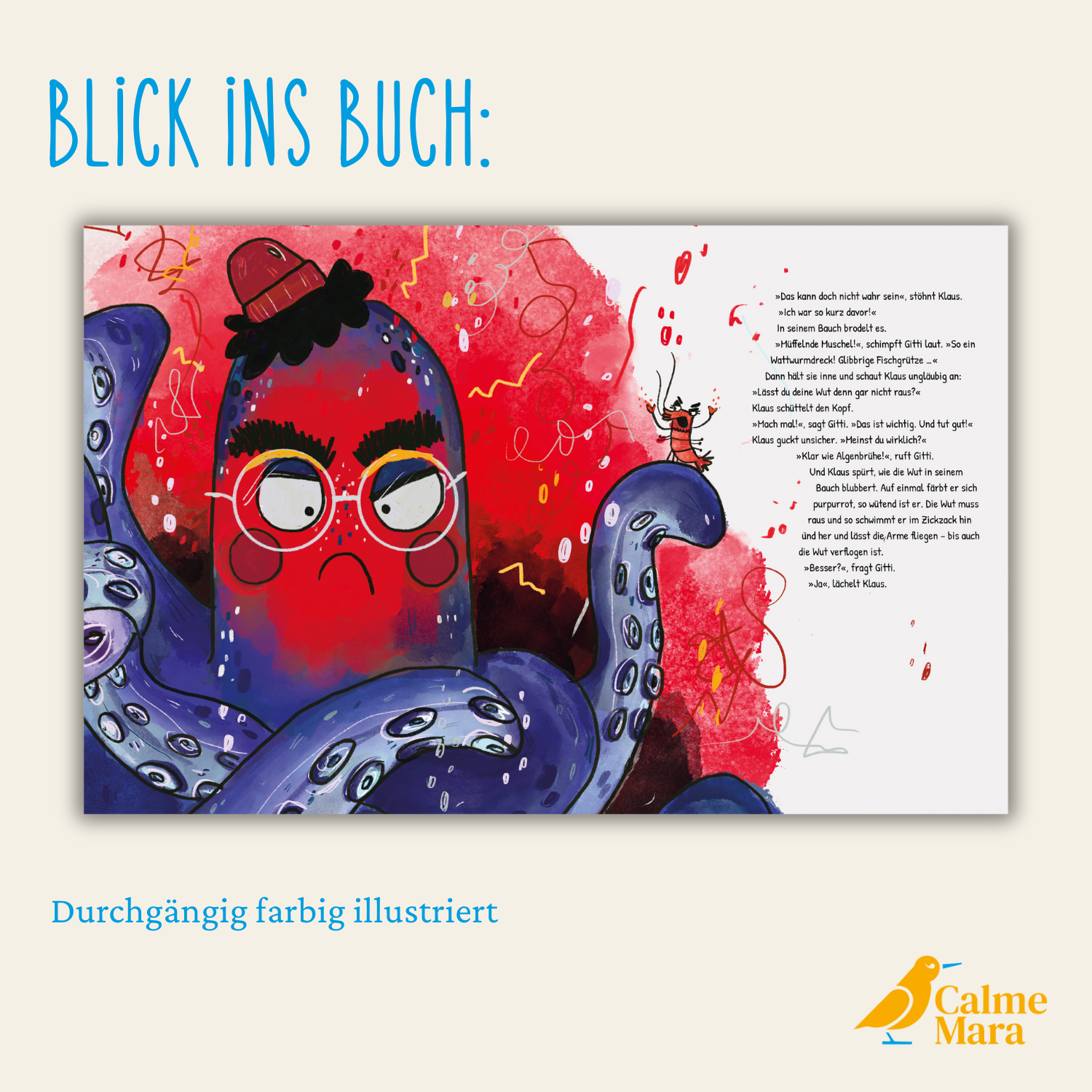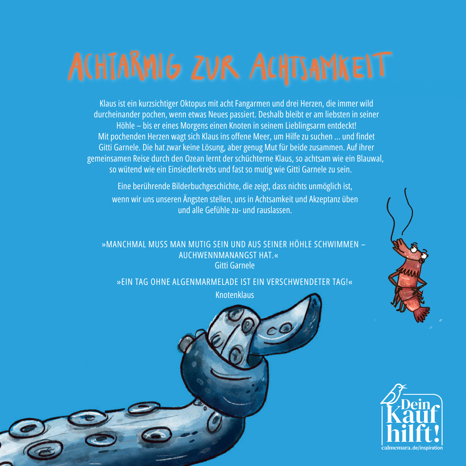 Klaus ist ein kurzsichtiger Oktopus mit acht Fangarmen und drei Herzen, die immer wild durcheinander pochen, wenn etwas Neues passiert. Deshalb bleibt er am liebsten in seiner Höhle – bis er eines Morgens einen Knoten in seinem Lieblingsarm entdeckt! Mit pochenden Herzen wagt sich Knotenklaus ins offene Meer, um Hilfe zu suchen … und findet Gitti Garnele. Die hat zwar keine Lösung, aber genug Mut für beide zusammen. Auf ihrer gemeinsamen Reise durch den Ozean lernt der schüchterne Knotenklaus, so achtsam wie ein Blauwal, so wütend wie ein Einsiedlerkrebs und fast so mutig wie Gitti Garnele zu sein.