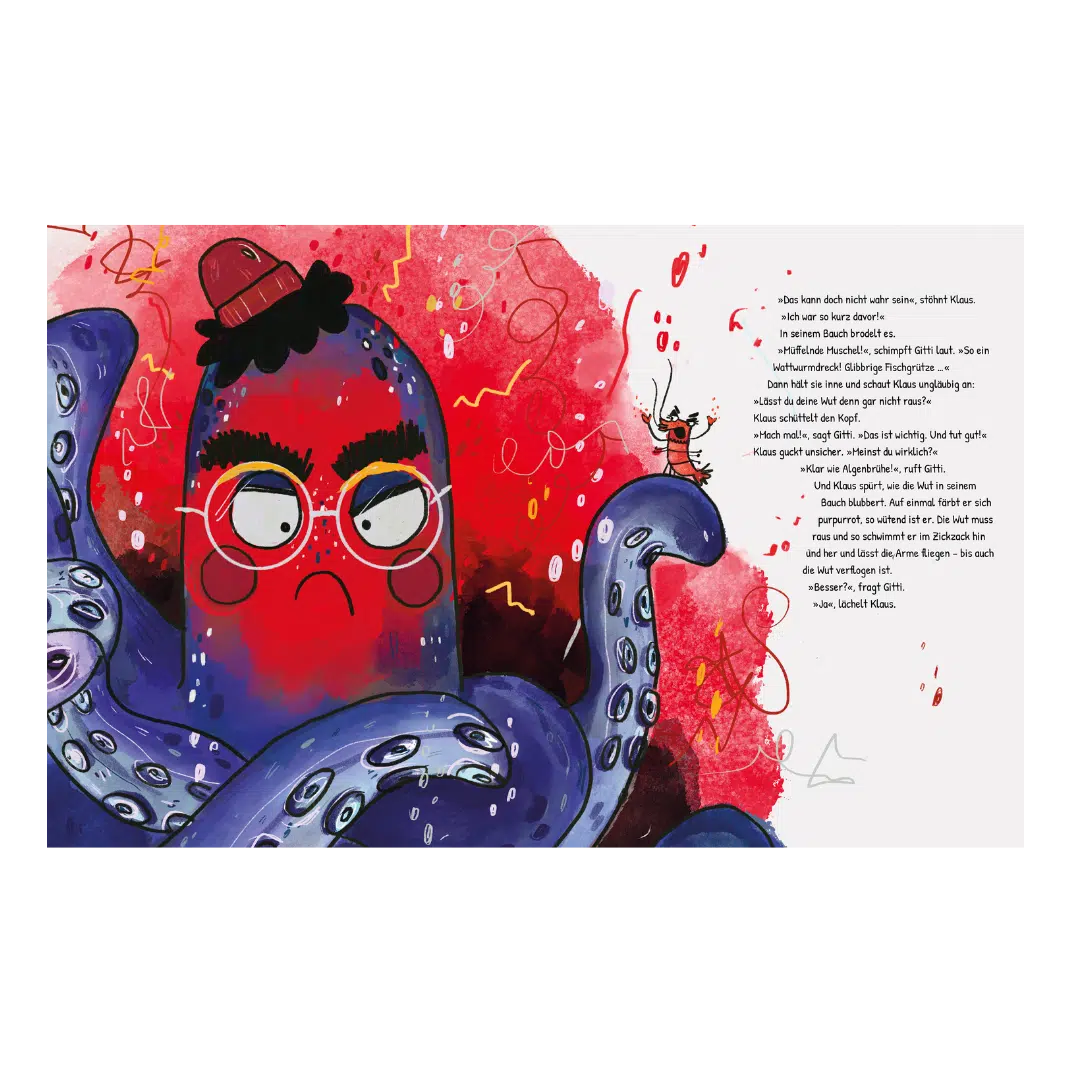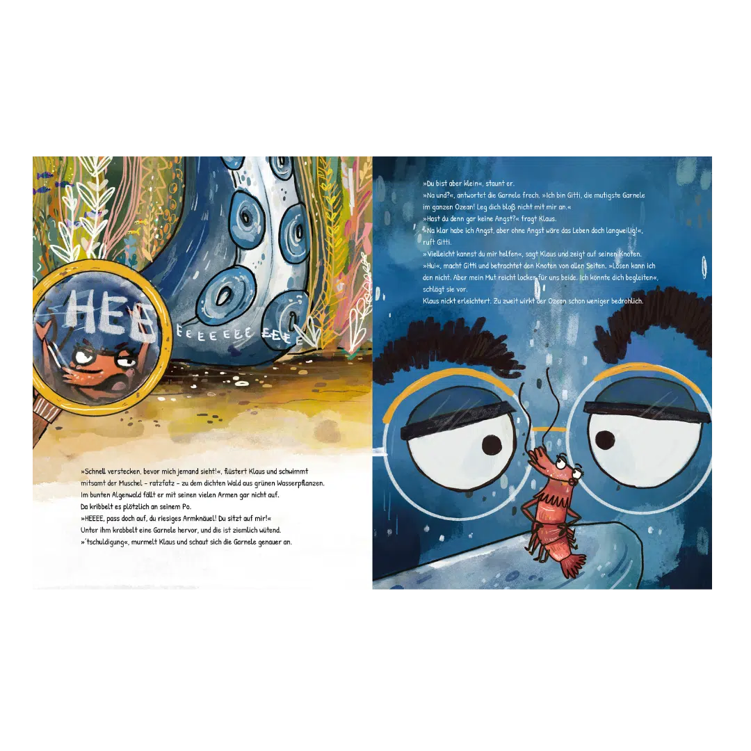 Klaus ist ein kurzsichtiger Oktopus mit acht Fangarmen und drei Herzen, die immer wild durcheinander pochen, wenn etwas Neues passiert. Deshalb bleibt er am liebsten in seiner Höhle – bis er eines Morgens einen Knoten in seinem Lieblingsarm entdeckt! Mit pochenden Herzen wagt sich Knotenklaus ins offene Meer, um Hilfe zu suchen … und findet Gitti Garnele. Die hat zwar keine Lösung, aber genug Mut für beide zusammen. Auf ihrer gemeinsamen Reise durch den Ozean lernt der schüchterne Knotenklaus, so achtsam wie ein Blauwal, so wütend wie ein Einsiedlerkrebs und fast so mutig wie Gitti Garnele zu sein.