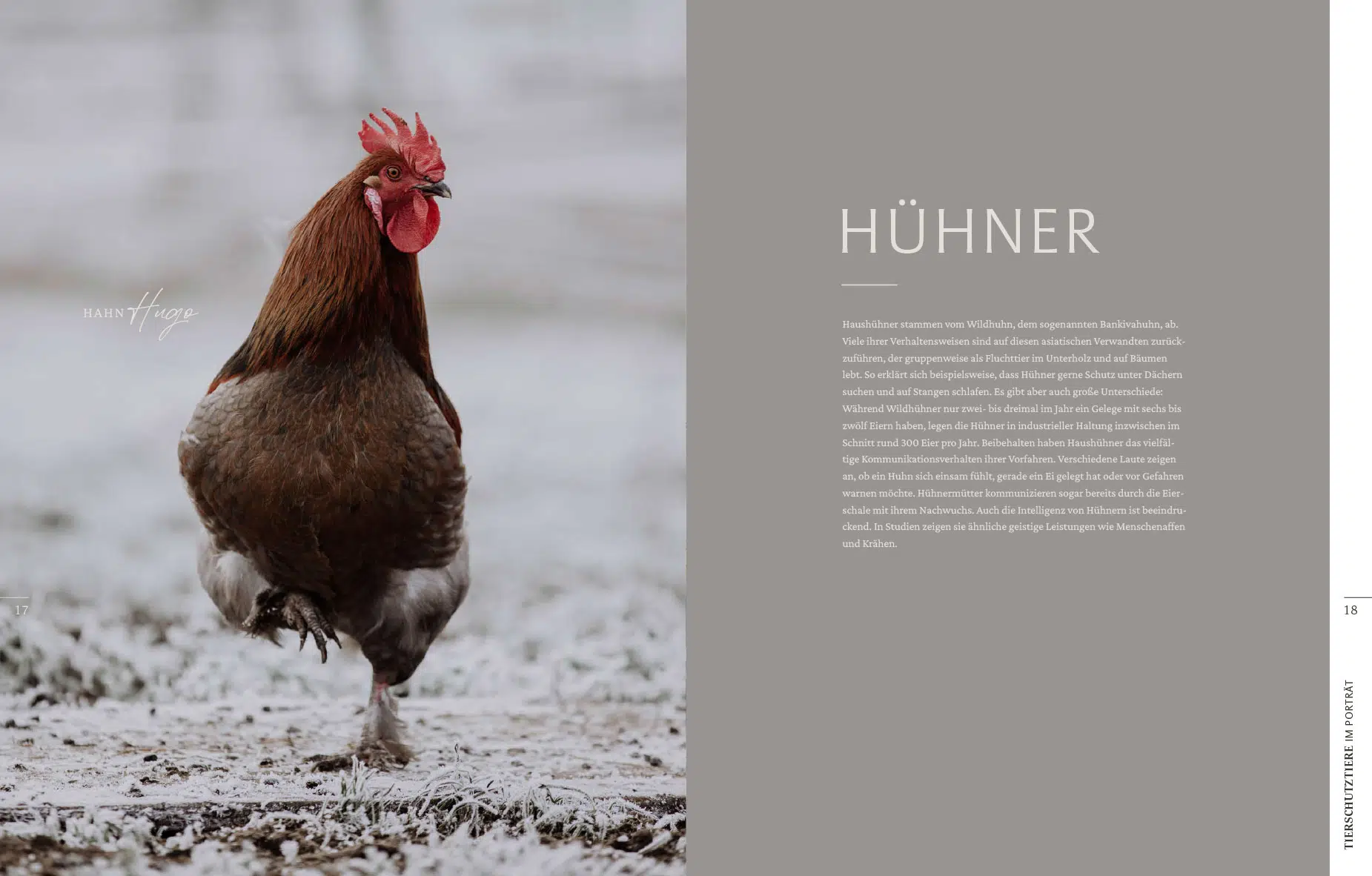 Tierschutz wird in dem stimmungsvollen Bildband »Tierschutztiere im Porträt« von Fotografin Ronja Erdmann inhaltlich und greifbar großgeschrieben. Als Buch-Begegnung der besonderen Art lädt es große und kleine Tierfreunde dazu ein, ehemalige sogennante Nutztiere auf Augenhöhe kennenzulernen. Die nachhaltige und vegane Herstellung in Deutschland unterstreicht auch auf Produktionsebene noch einmal das wichtige Thema Tierwürde.