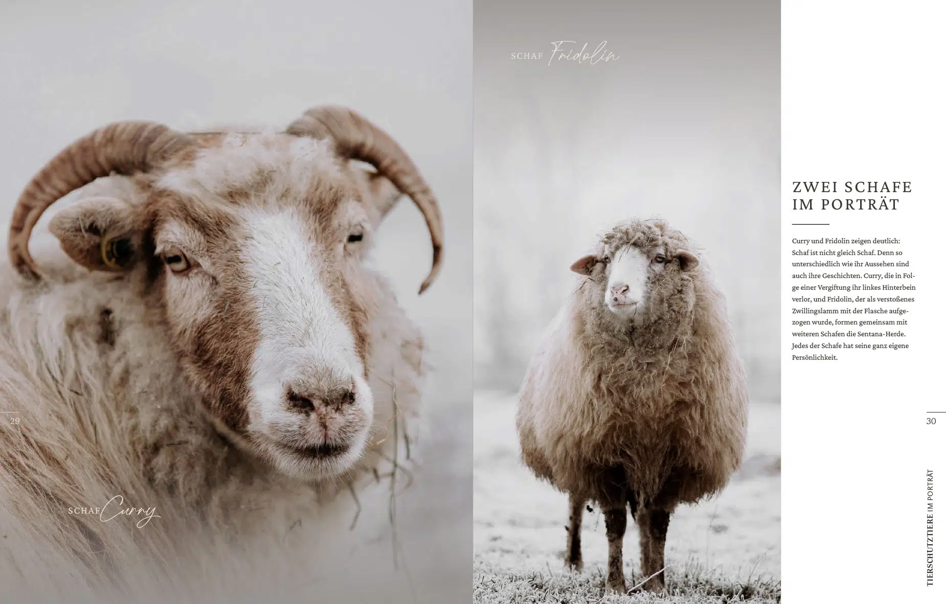Die tierischen Fotomodelle aus dem Bildband leben im Begegnungs- und Gnadenhof Dorf Sentana in Bielefeld. Jeder Buchkauf unterstützt dort ihre artgerechte Haltung und die tiergestützten sozialen Projekte im Dorf.